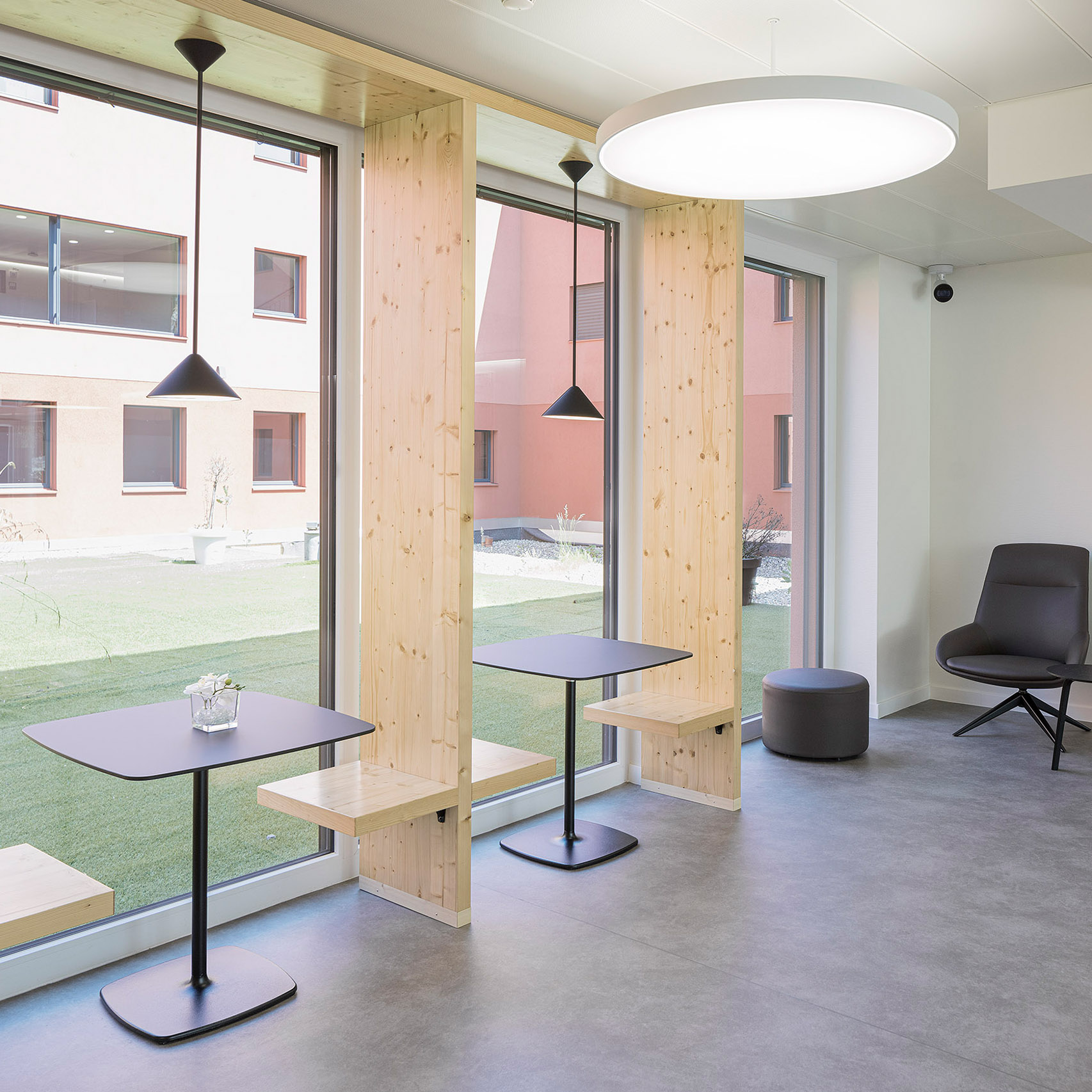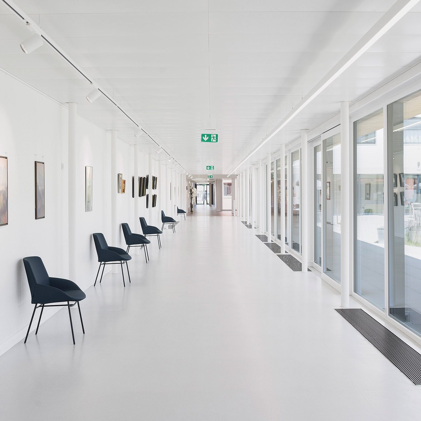 Depuis l’entrée des visiteurs, on traverse des couloirs baignés de lumière naturelle grâce aux patios extérieurs, en passant par les services médicaux et les chambres.